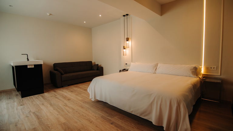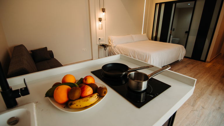 Living equipado con placa eléctrica para cocinar,frigorífico y sofá cama,Tv Hd con programación nacional e internacional, wifi gratuito, aire acondicionado , caja de seguridad, secador de cabello, ketle eléctrica.